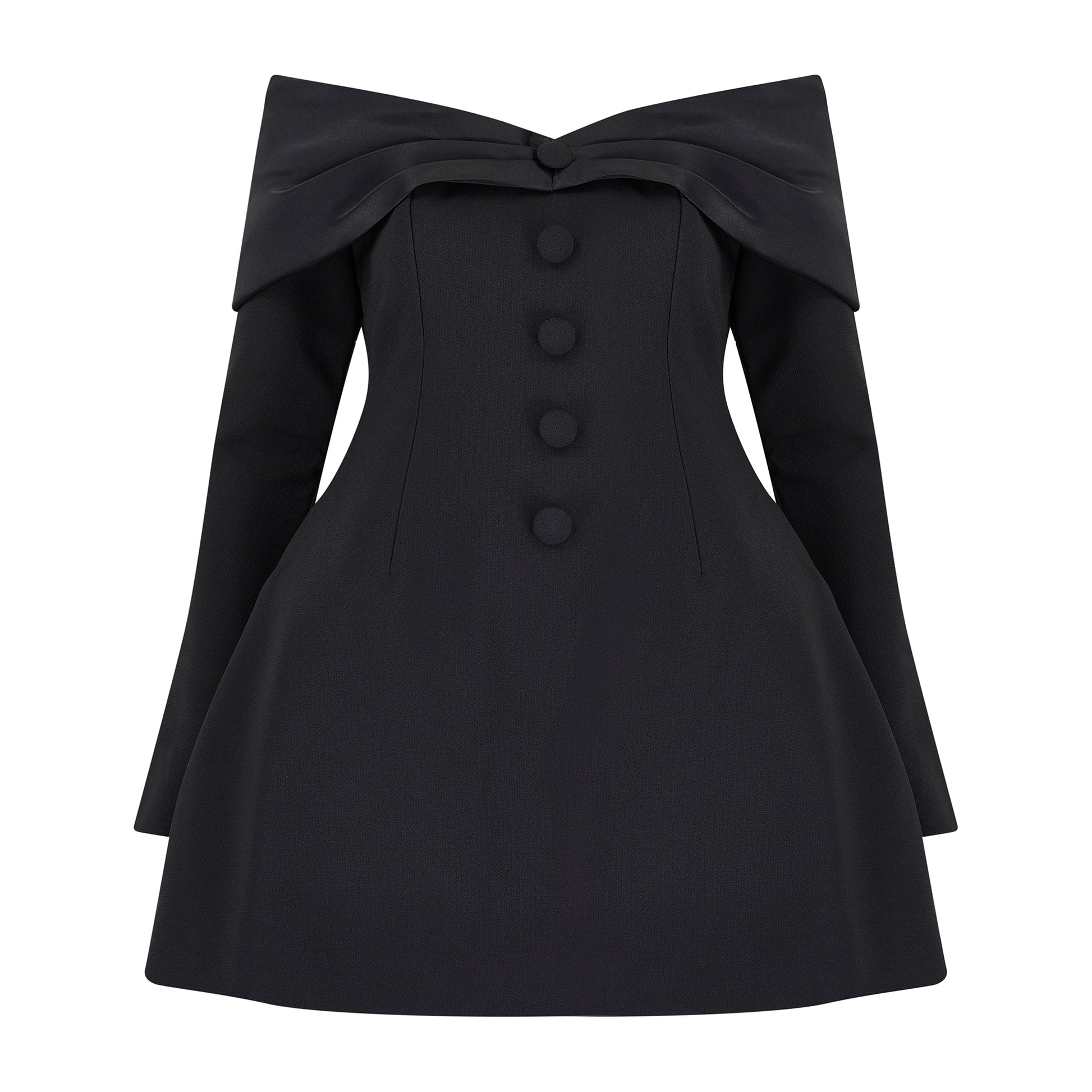 If elegance was a dress, she would be it. Defined by its sweeping, off-the-shoulder neckline carefully crafted in a satin bow silhouette. Our dedication to bringing our muses the utmost timeless yet statement mini dresses is reinforced, as the satin bow graces the shoulder extending into our signature split sleeves. The subtle contrast of the satin neckline and our signature luxury fabric that embodies the bodice seamlessly blends opulence with delicacy curating a classic touch for the timeless party looks.