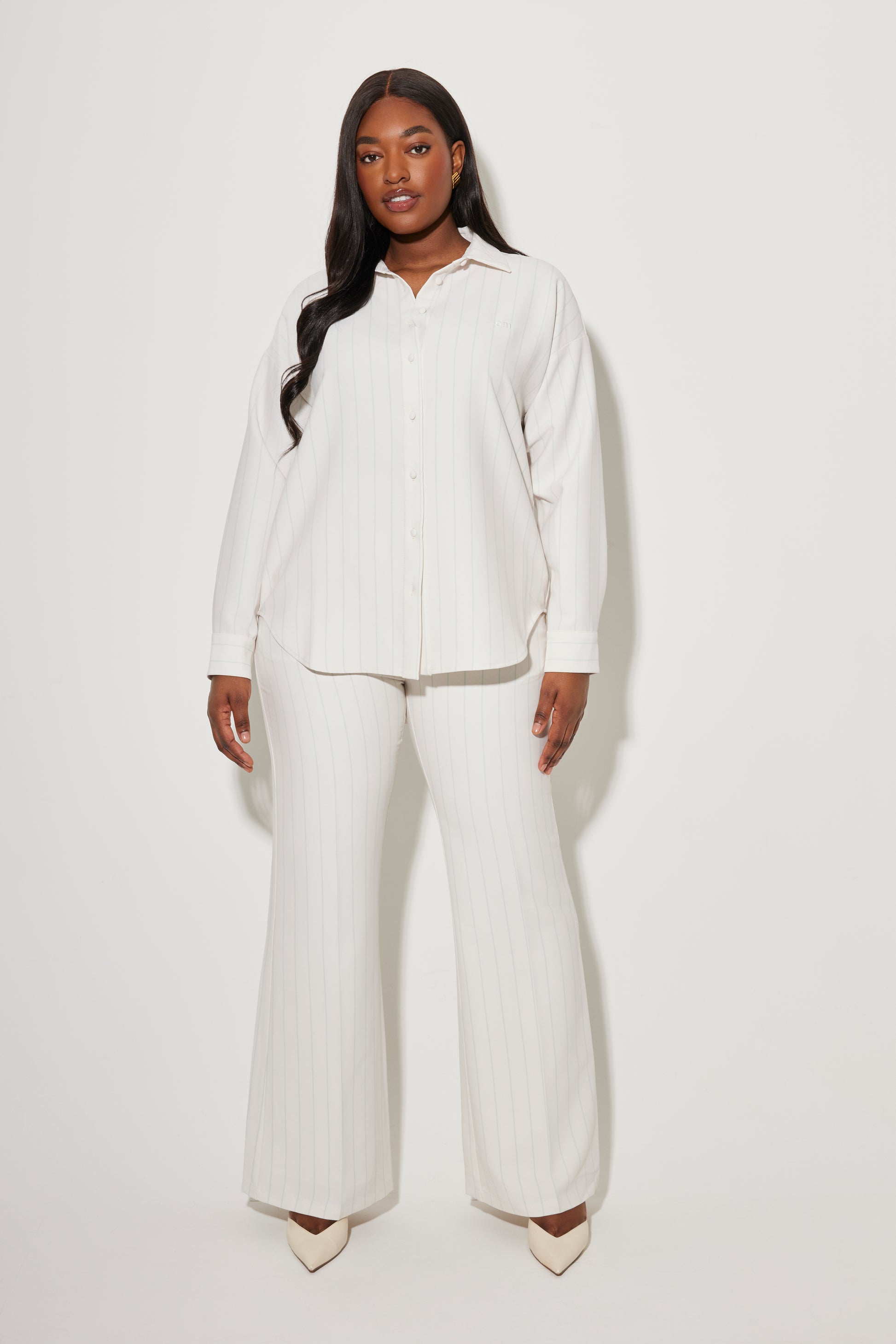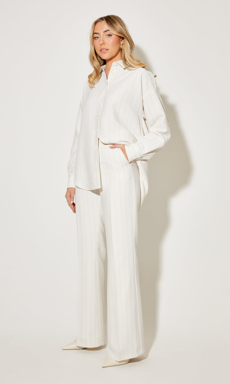 Introducing our new stripe button-down shirt, the perfect addition to any spring wardrobe. Featuring timeless pin stripes, this shirt is both stylish and versatile. Lightweight and breathable, it offers all-day comfort whether you're dressing up for a meeting or keeping it relaxed on the weekend. Pair with our matching pinstripe trousers or your Ultimate Muse wide-leg trousers for a chic, coordinated look.
