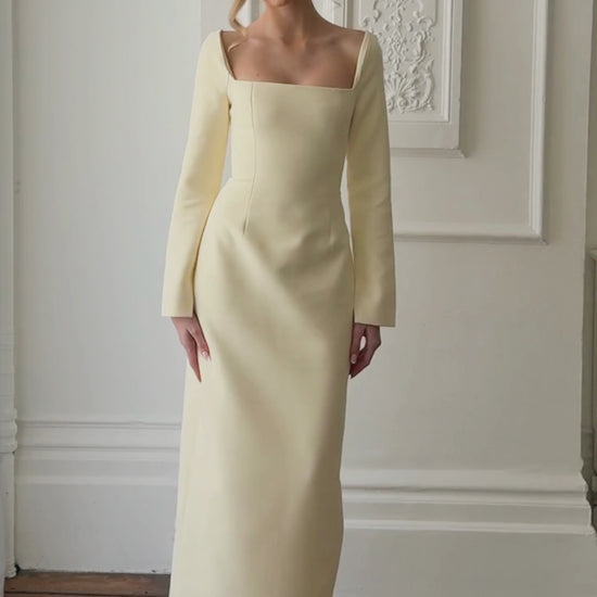 Introducing the Framed Neckline Maxi Dress. Defined by a signature square neckline, full length sleeves and a softly structured waist. This dress exudes timeless elegance in a soft Buttercream shade, perfect for every muse bridesmaid moment.
