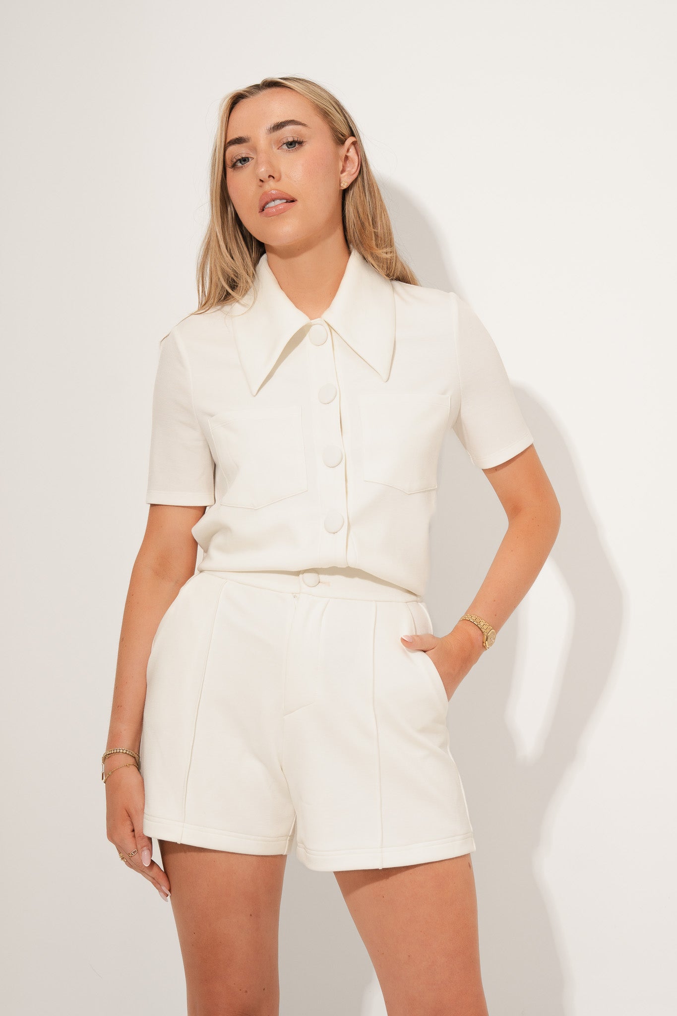 Elevate your off-duty look with The Ultimate Muse Short Sleeve Loungewear Top. Featuring our signature wide collar, covered buttons, and relaxed tailoring, this piece blends everyday comfort with effortless style. Perfect to pair with our Loungewear shorts