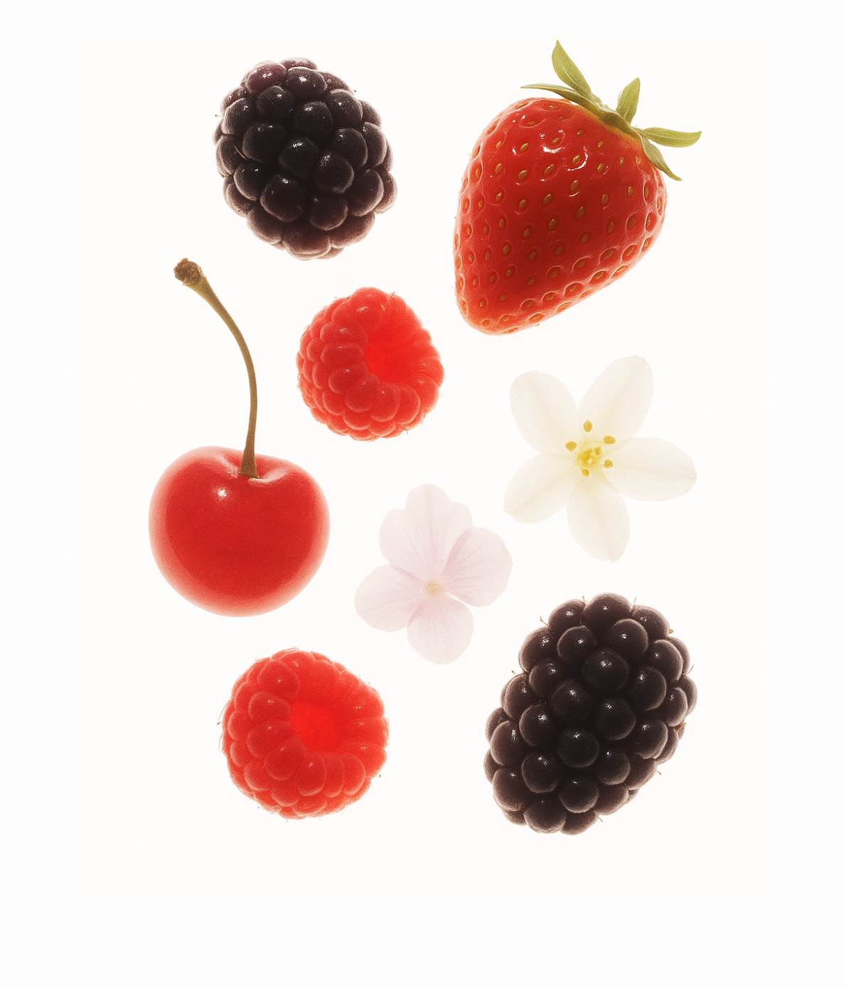 Top: Candied Berries, Raspberry, Strawberry, Blackberry, Cherry