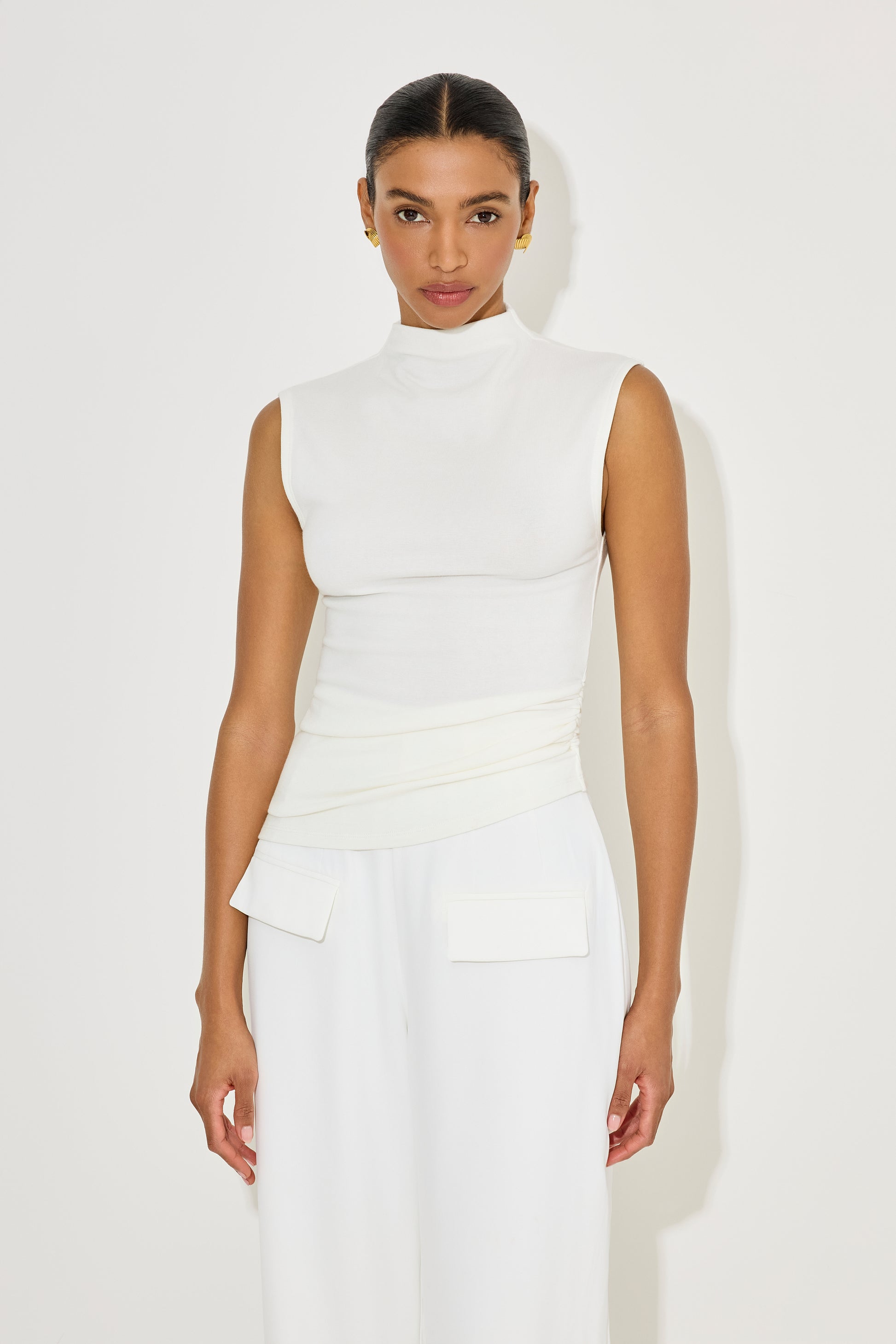 Embrace effortless sophistication with our sleeveless asymmetric top. Crafted in a luxurious, slinky knit that drapes and flatters every shape, designed with a high neck and asymmetric cut for a bold yet elegant look. Perfectly modern, timelessly chic.